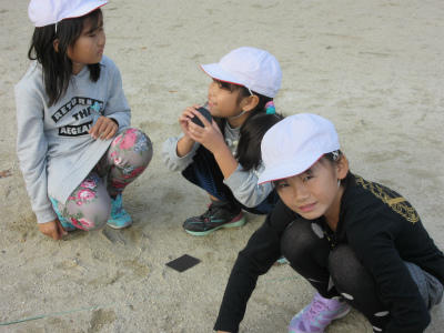 3年生が理科の学習で、虫めがねを使って光を集めていました。ちょうど、雲に覆われてなかなか光が出てこなくて、困っていました。終わり頃に太陽が顔を出してくれました。