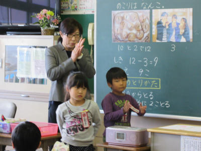 いよいよ今日、研究発表会でした。1年生は、12-3の計算のしかたを考えようについて学習していました。とてもいい意見を出していて、参観者の方が喜んでいました。