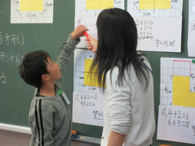4年生も、頑張っていました。4年生は、複合図形の面積の求め方について学習していました。複合図形の形を、くつ下の図形と名付けて取り組んでいました。