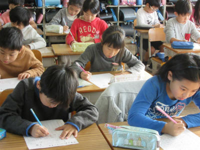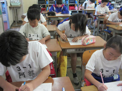 2年生、3年生が、一生懸命に計算大会をやっていました。100マス計算を速い子は、2分台で終わってしまいました。すごい頑張りですね。