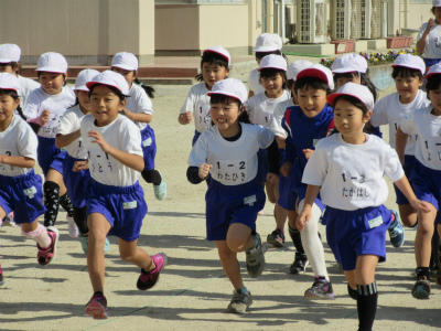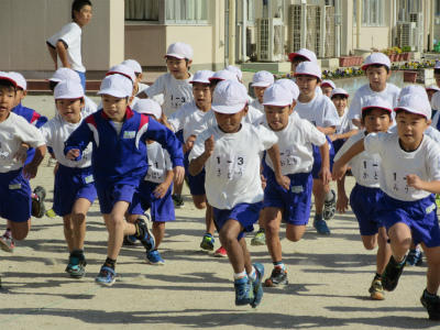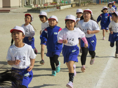 校内持久走大会が予定通り行われました。1年生は、小学校初めての持久走大会です。走る距離は800mです。どの子も、すごい頑張りでスタートしました。