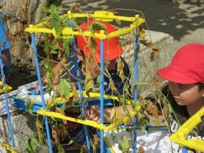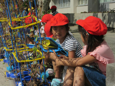 運動会が終わり、落ち着いた学校生活がもどって来ました。1年生が昇降口付近で、あさがおの観察をしていました。よく見ると、種ができているという声が聞こえました。よかったですね。