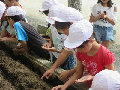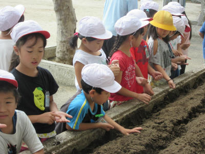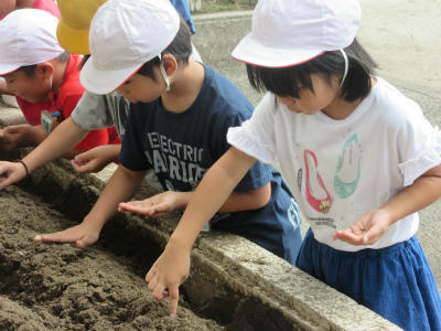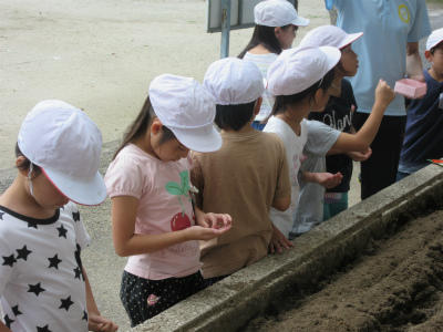 1人が5・6つぶの種を持ちながら、花だんに種をまいていました。大根の世話をしっかりやってください。大根の種を大事そうに持っているのが印象的でした。