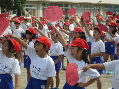 紅白応援合戦の練習がありました。紅組の応援は、とても大きな声が出ていました。団長を中心によく頑張っていました。