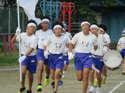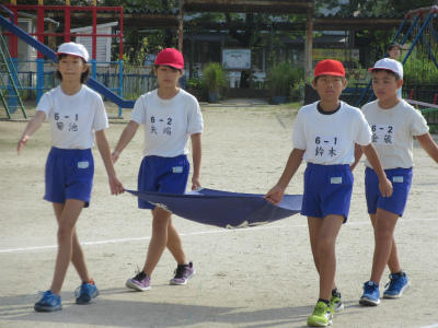 5年生と6年生が、騎馬戦の戦いを行っていました。大将を守りながら、うまい戦いをしていました。どっちかのチームが全滅するまで、戦っていました。