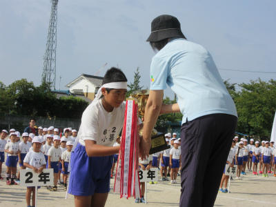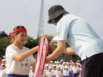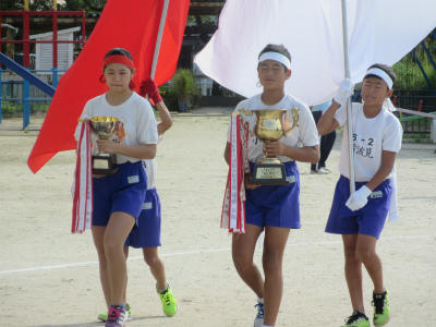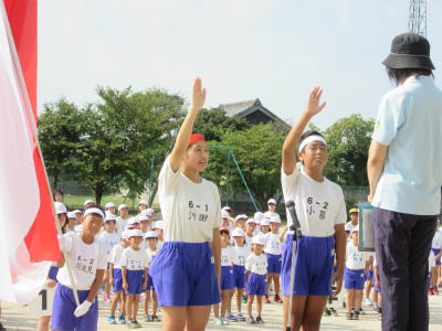 昨年度、優勝は白組でした。優勝杯の返還と準優勝杯の返還をしてから、全体練習に入りました。今年は、どちらが優勝するでしょう。選手宣誓も立派でした。