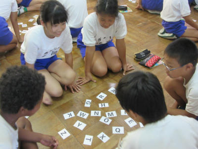 5年生の英語学習で、最後にアルファベットをとるかるたゲームをやっていました。グループで競ってやっていて、とても楽しそうでした。