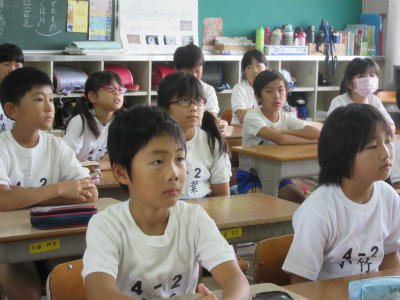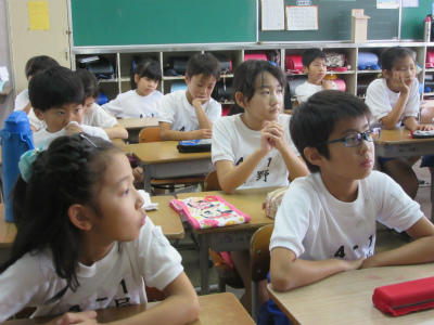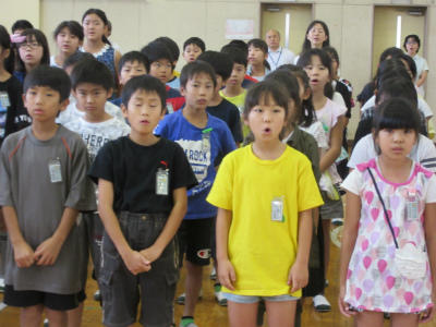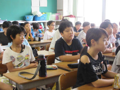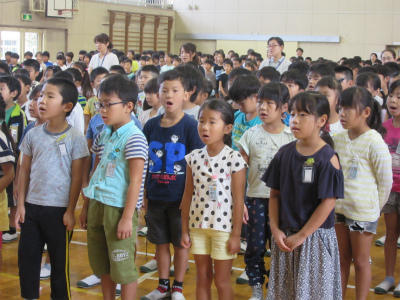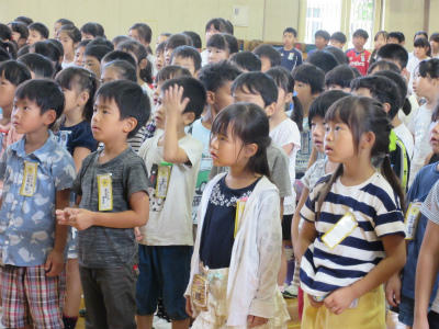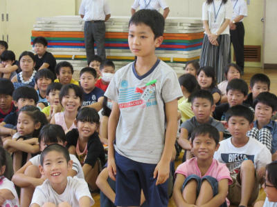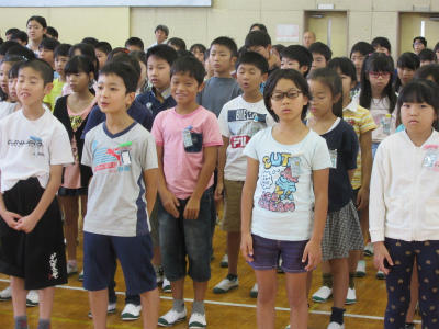 校長先生の話は、夏休みベスト5の話がありました。昨日のサッカーの結果や花崎徳栄高校の優勝、世界陸上のリレー、内山選手の不屈の精神、本校にいる世界大会優勝者の児童をみんなで讃えました。