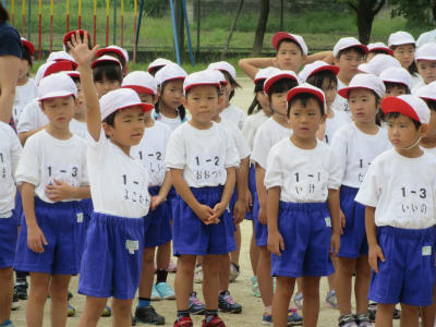 運動会の全体練習が始まりました。各学年とも、紅白が決まり、全体の隊形もできました。今日は、体操隊形に開けともとの位置に集まる練習をしました。