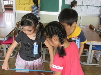 1年生が紙テープを使って、長さ比べをしていました。机のたてとよこ、どっちが長いのか?鍵盤ハーモニカの入れ物のたてとよこ、どっちが長いのか?、グループごとに、仲よくしっかりやっていました。