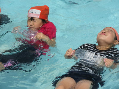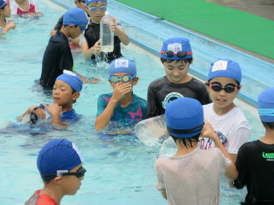 3年生が、着衣泳をやっていました。自分で浮きがとれるようにあおむけになって、ペットボトルを利用して、訓練していました。なかなかうまくいかなかったようです。