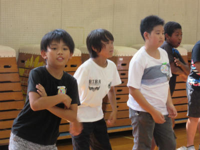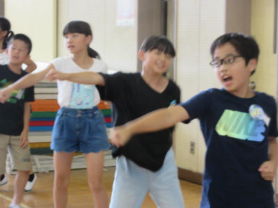 5年生が、1日目の夜に行うキャンプファイヤーの練習をしていました。朝のオーディションの様子と違い、ウルトラスーパー元気でした。楽しく活動ができるといいですね。