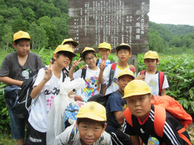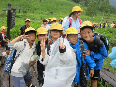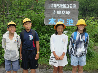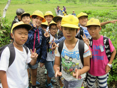 林間学校、1日目がスタートしました。朝から、とても元気に出発をしました。最初の目的地は木戸池のハイキングでした。ちょっと雨が心配でしたが……