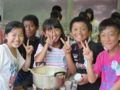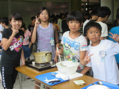 夕飯は、カレー作りでした。本来は、外でかまどを使ってカレーを作る予定でしが、またまた雨が降ってきて、屋根の下でコンロを使って行うことにしました。とてもおいしくて何杯もお替わりをしていました。