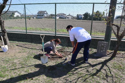 体育館近くの畑では、2年生が先生と一緒に畑の草取りをがんばっていました。