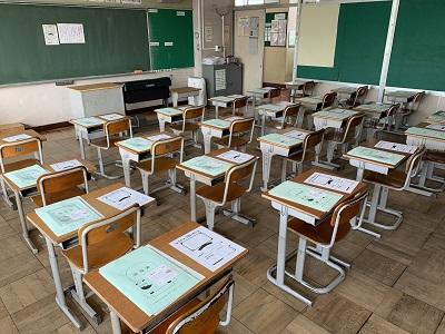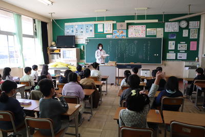 6年生は理科室で理科の授業を行っていました。1つのテーブルに2~3人互い違いに座っていました。ソーシャルディスタンスを守りながらの授業風景でした。