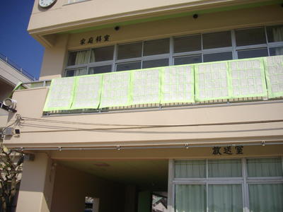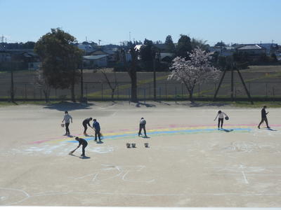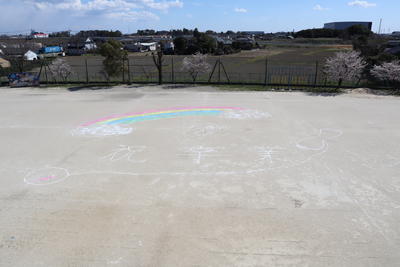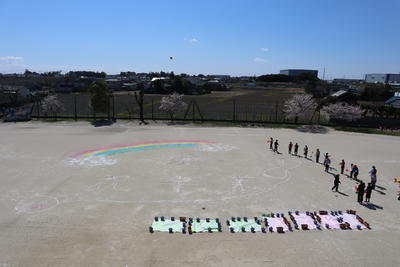 6年生担任の図案をもとに「虹」「校章」「けん玉」「祝卒業」を描きました。