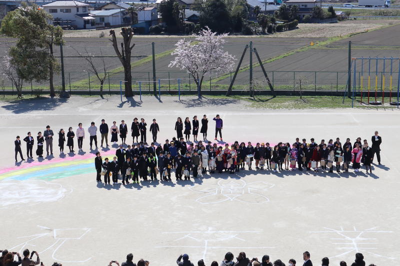 大空にかかる虹に 卒業生と教職員が並び 旅立ちを祝います