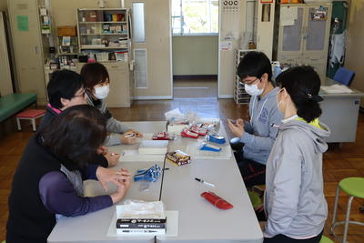 「科学のへや」では、牛乳パックから五角形・六角形のパーツをつくり組み立てていきました。