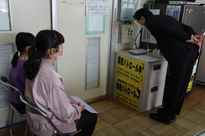 業間休み時間に、通学班の班長が集合し、校長先生と安全主任の先生から安全安心な登下校について聞きました。