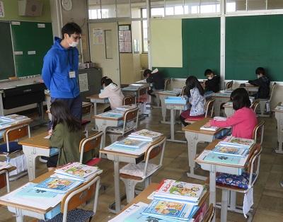 おとなりの2組に行くと英語の授業を行っていました。担任、JTE,ALTの3人が授業を進めていました。