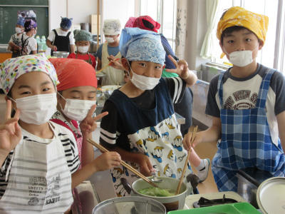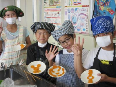 5年生が温野菜の調理をしていました。にんじんをゆでて、お皿の上で、ミッキーマウスにしたり、建物のようにしたりして、工夫していました。