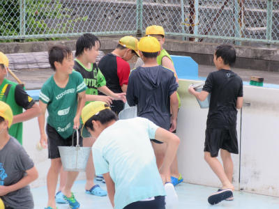 6年生が、最初はまじめにプール掃除をしていました。そのうちに、プールではないところに水をかけていました。とにかく、全員でしっかりきれいに取り組んでいました。