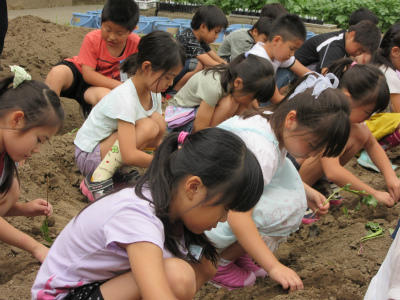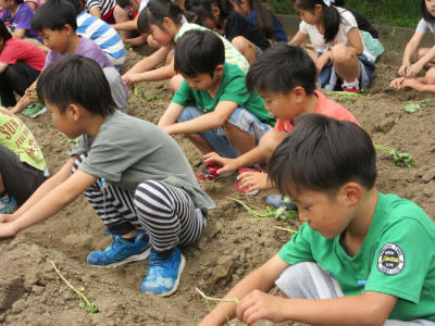 2年生が150本のさつまいもの苗を植えました。クラスごとに分かれて、1人2本ずつ植えました。大きく育つといいですね。