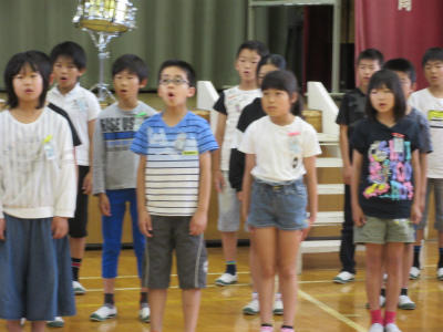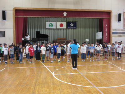 5年生70人の歌声が、体育館中に響きわたりました。練習の成果があって、とてもきれいな歌声でした。6年生の感想発表でも、歌声を褒めていました。