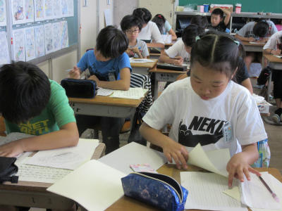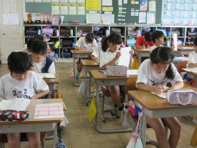 校内硬筆展が一斉に行われました。クリーム色の清書用紙に集中して頑張っていました。明日の廊下掲示の賞が楽しみですね。