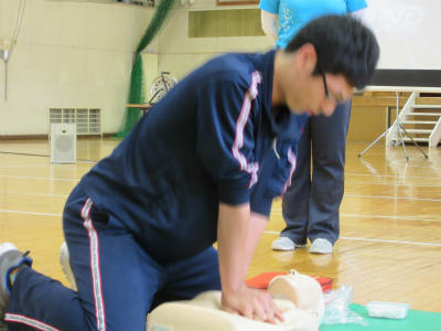 今日、心肺蘇生法の研修会を行いました。1人1人が実際に実技を行い、AEDを活用して研修をしました。水泳学習が始まりますので、十分に気をつけて指導したいと思います。