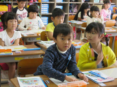 1年生の教室の方から、元気な歌声が聞こえてきました。動作を交えながら、大きな声で歌を歌っていました。とても楽しそうですね。