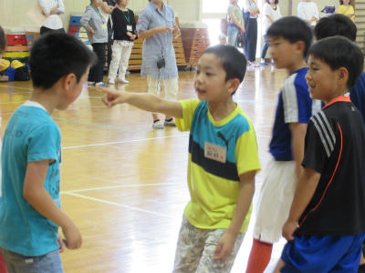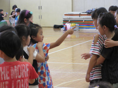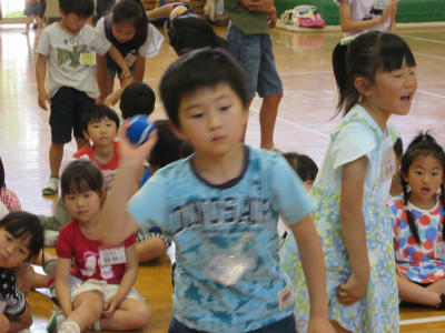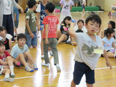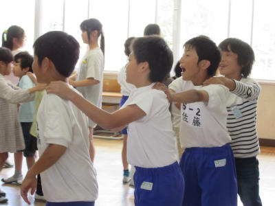 最後に、全体ゲームとして、じゃんけん列車を行いました。ただのじゃんけんではなく、あっち向いてほいのじゃんけんをしました。てとも長い列車ができました。