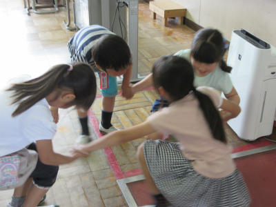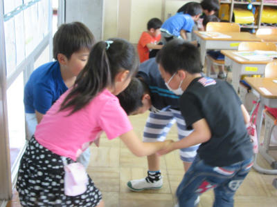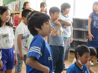 5年生が、あいさつの会話をやっていました。AさんからBさんへ、BさんからAさんへという会話でした。楽しそうに活動していました。先生の指示をよく聞かないとできないゲームをしていました。
