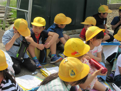 2年生が、野菜の苗の観察をしていました。ミニトマトは、全員で植えたので、別のなすやピーマン、おくら、きゅうりなどの苗を観察していました。