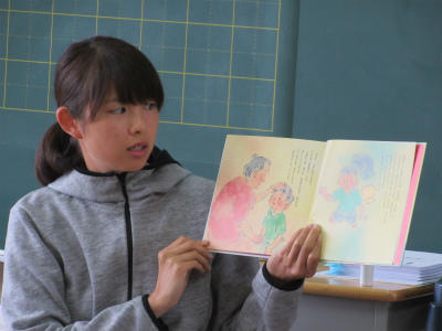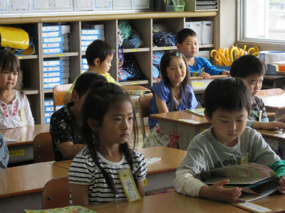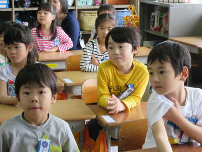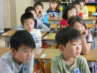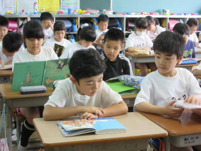 1年生が、読書タイムの時間に担任の先生が読み聞かせをしていました。今日は、ボランティアの方が来ないので、代わりに読んであげたそうです。