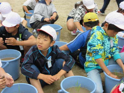 1つのバケツに、2本の苗を植え付けていきました。稲は、水の管理が重要ですので、明日からしっかり気にしてやってください。