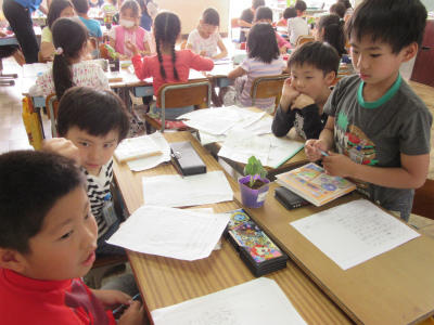 1年生が2回目の学校たんけんをしていました。今日は、特別教室まで入って、どんな教室かをしっかり観察していました。教室にもどって、何があったか確認していました。