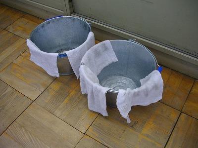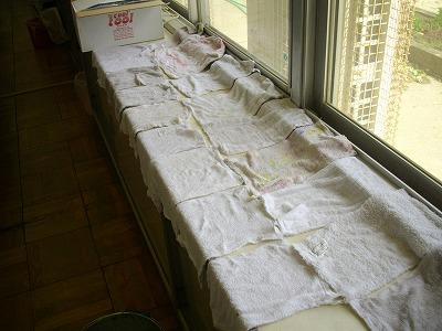 吹き込んだ水をふきとった雑巾が職員室に並んでいます。