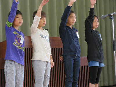 今日の朝会は、JRC登録式でした。ボランティア委員会の児童の計画で、全員の名簿を作成して、提出しました。432名で、誓いの言葉を行いました。