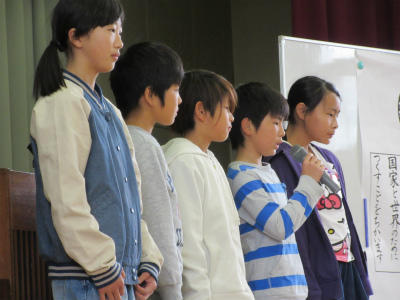 JRC登録式では、1年間の活動報告がありました。5月30日のクリーンパトロールをスタートに、緑の羽根募金、赤い羽根募金、エコキャップ集め、災害募金活動など、たくさんの活動があります。1人1人の活躍を期待しています。