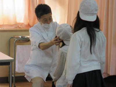 1年生と2年生、3年生、5年生が聴力検査を行いました。聞こえたら、手を挙げてねという指示に従って、1人1人がしっかりと検査を受けていました。
