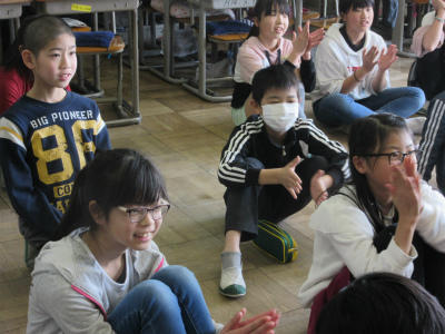 4年生がお楽しみ会をやっていました。ちょうど震源地はどこだ?ゲームをやっていたので、とても楽しそうでした。写真をい撮っている私にも、鬼が分かりました。おもしろかったです。