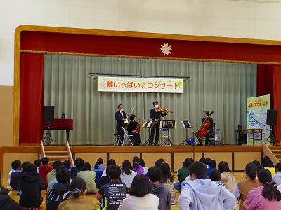 以前、六年生が、税の学習した際、よく感想等を書いたので、公益社団法人春日部法人会様がお計らいくださり、N響のメンバーの方による弦楽四重奏の演奏を鑑賞することができました。5,6年生が体育館で鑑賞させていただきました。