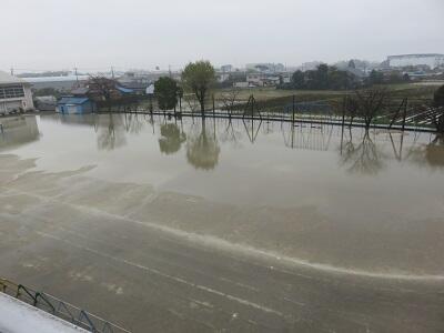 昨夜からの大雨で、校庭が湖のようになってしまいました。教室から校庭を見ていた南小っ子が「うみだー!」と叫んでいました。水はけがいいと言われていた本校の校庭。昼になっても一向に水が引きません。おかしい?と思い、再度、フェンス沿いの側溝を調べ、2mの金属棒でかきまわしてみると・・・