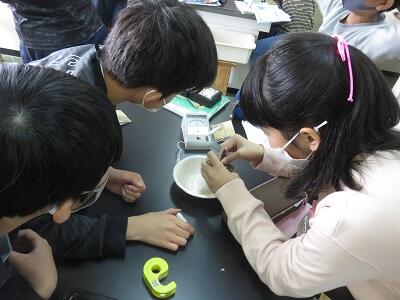 5年生が理科の学習で、「電磁石のはたらき」について学習していました。この時間の課題は、「コイルの巻き数が変わると電気の力も変わるのだろうか」ということで、40回巻きコイルと100回巻きコイルをつくり、回路の途中に検流計も接続して実験を行いました。さて、結果は・・・。ほほーっと、結果が分かりました。やってみること、実験は偉大です!