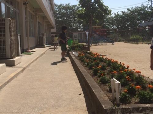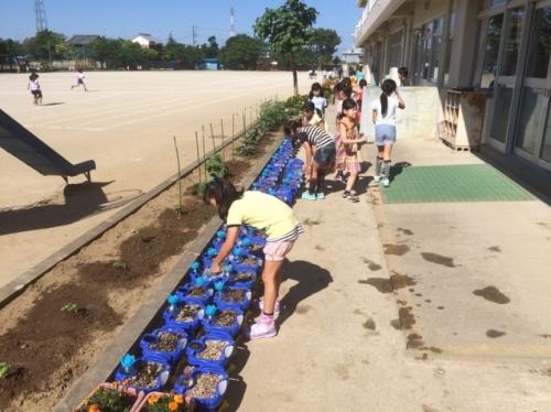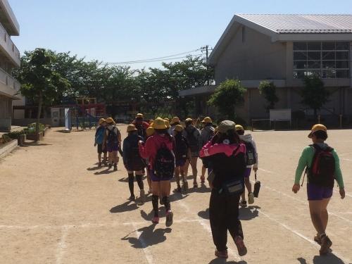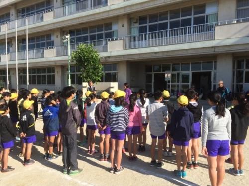 市内陸上大会に参加する児童が、集まってきました。気持ちも高まり、自然と体が動くようです。間もなく会場に出発します。