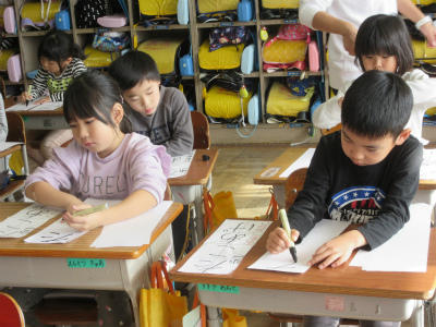 1年生は、1時間目から書きぞめ競書会に挑戦していました。1年生の課題は、「たこあげ」です。手本を見ながら、一生懸命に書いていました。