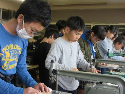 6年生が、糸ノコを使って、板を切っていました。なかなか組み立てまでを考えての作品なので大変そうでしたが、興味深く取り組んでいました。