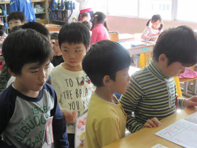 1年生のチャレンジタイムの国語は、漢字をやっていました。漢字が書けると、すぐに先生の所に並んで丸をつけてもらっています。